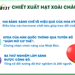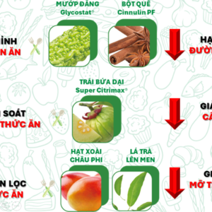 Sản phẩm là sự hội tụ các thành phần quý giá chiết xuất từ quả mướp đắng (khổ qua), trái bứa dại (trái đằng hoành), tinh bột quế, hạt xoài châu Phi, lá trà lên men… Được phát triển & sản xuất bởi các nhà khoa học – bác sĩ người Mỹ. Sản phẩm đạt được cấp bằng sáng chế về tính độc quyền & chuyên biệt của từng nguyên liệu, được chứng minh hiệu quả lâm sàng về: