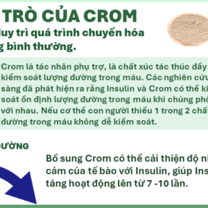 Đồng thời, sản phẩm có bổ sung Crom, thành phần giúp thúc đẩy hoạt động của Insulin, đặc biệt hiệu quả với các bệnh nhân tiểu đường.