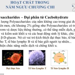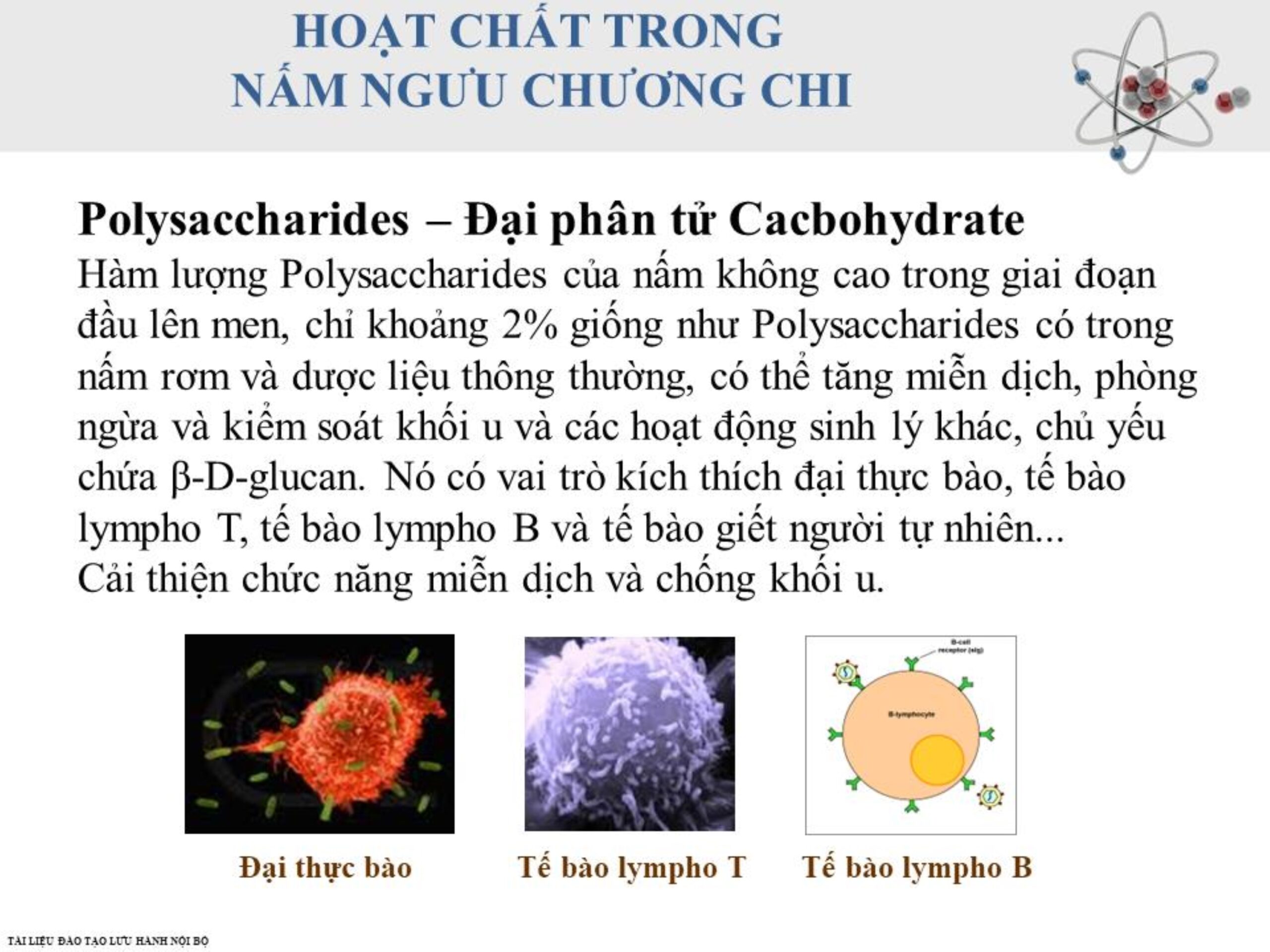 - Kế thừa tất cả đặc tính của sản phẩm Nấm ngưu chương chi DLC. Thành phần quan trọng của Nấm Ngưu Chương chi để chống ung thư là Polysaccharides chiếm 24%. Có bằng sáng chế kép của Mỹ và Đức về ức chế virut viêm gan B, chống viêm, chống ung bướu.