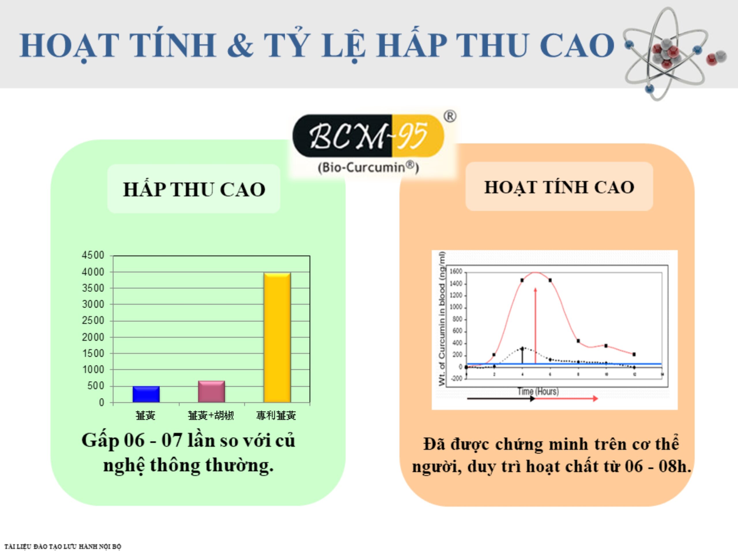 - Bổ sung 60mg tinh chất Nghệ – Bio Curcumin hàm lượng 95% từ rễ chính củ nghệ (BCM- 95) tăng tỷ lệ hấp thu lên 6 -7 lần và hoạt tính liên tục 8 -10 giờ, đồng thời loại bỏ Axit Oxalic gây hại.